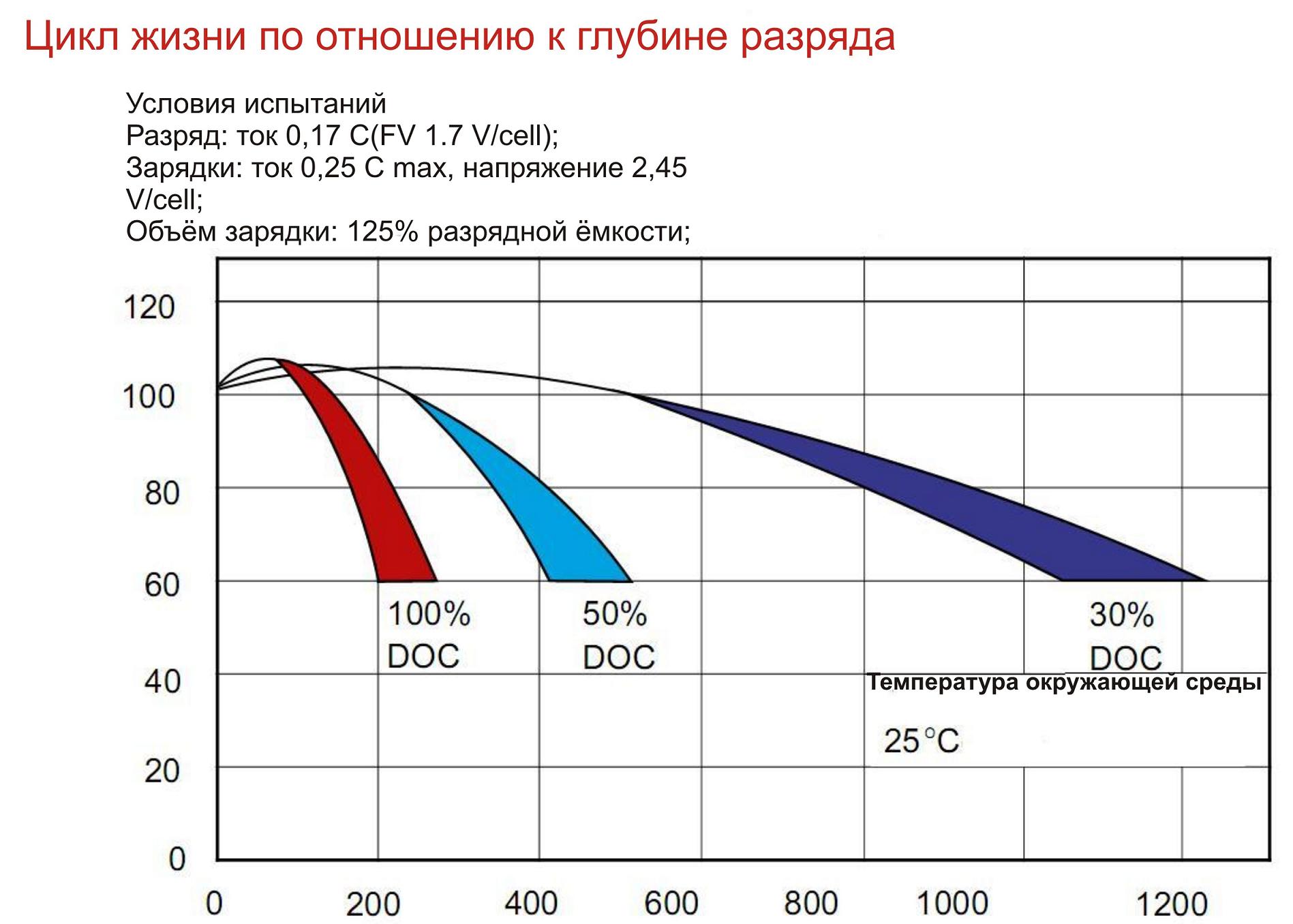 Аккумулятор технологии AGM способен выдержать до 200 циклов разряда/заряда с глубиной 100%, 350 — с глубиной 50% и до 800 — с глубиной 30%.